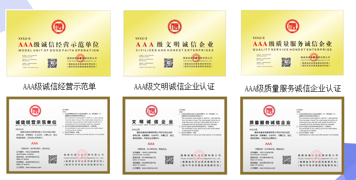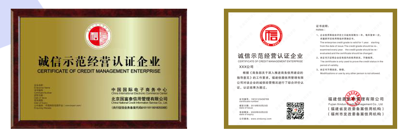 “中國誠信供應商”認證:國際貿易類,在全國行業信用公共服務平臺、中國電子商務網、中國商務信用平臺權威公示。