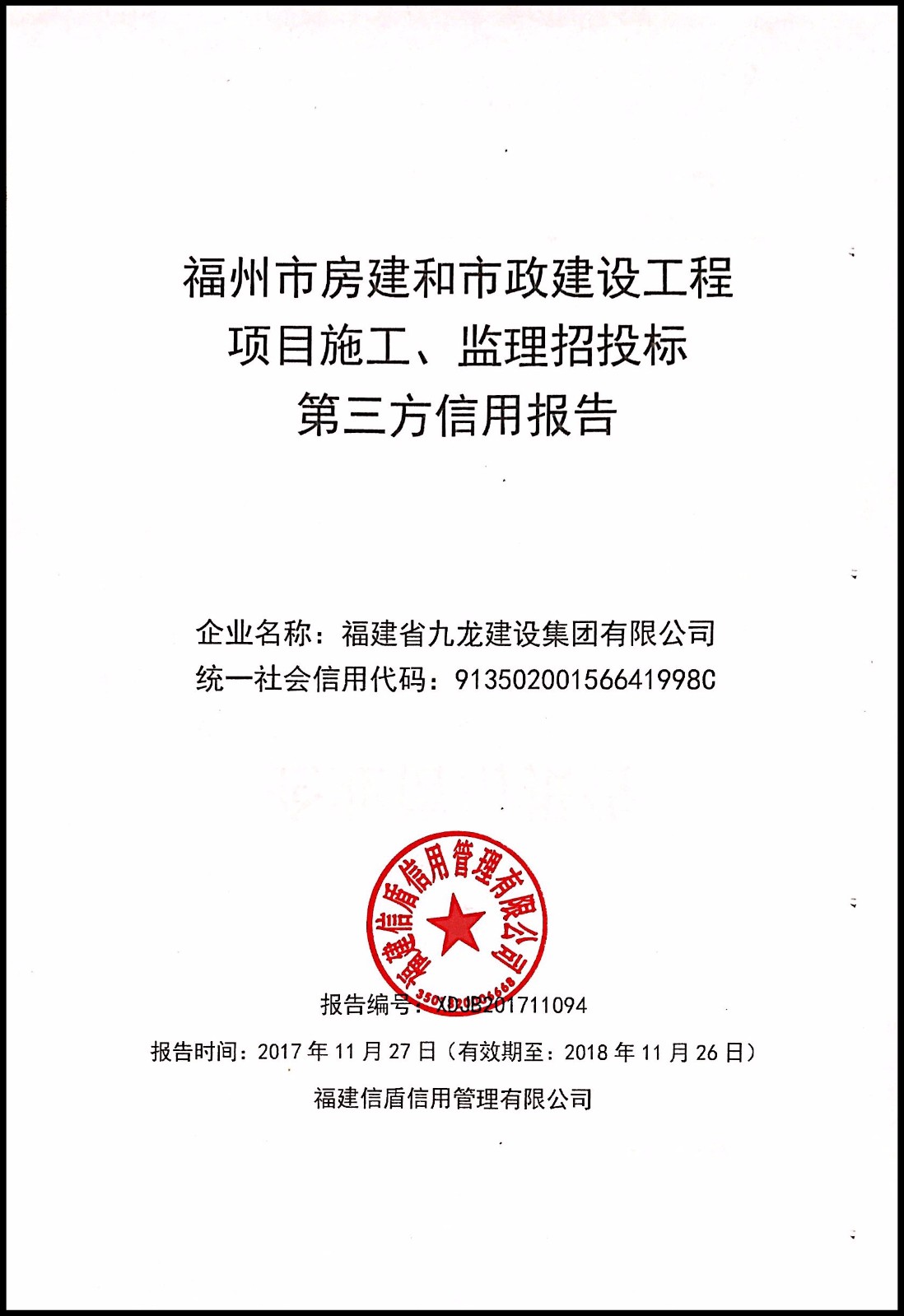福建省九龍建設集團有限公司 XDJB201711094