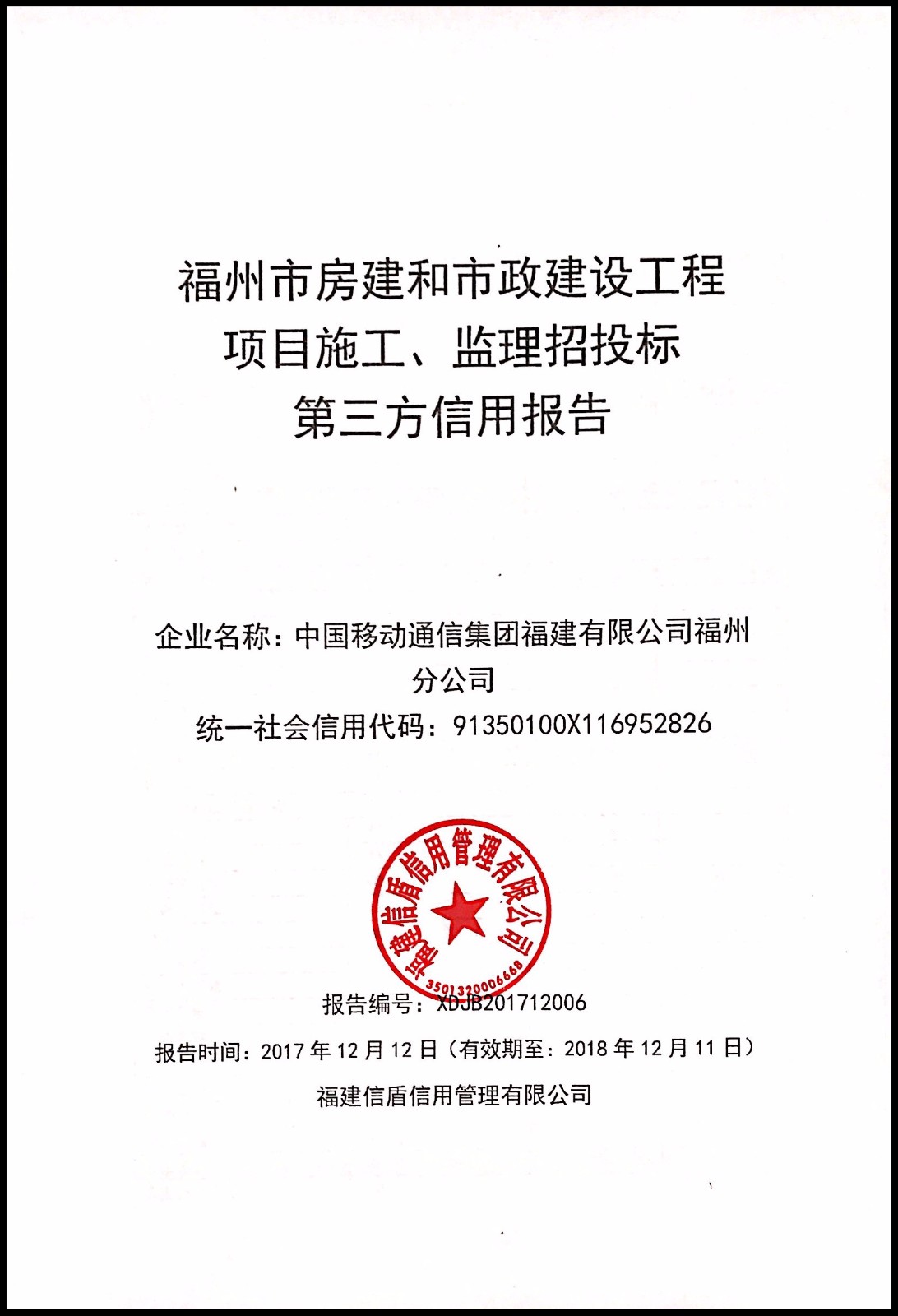 中國移動通信集團福建有限公司福州分公司 XDJB201712006