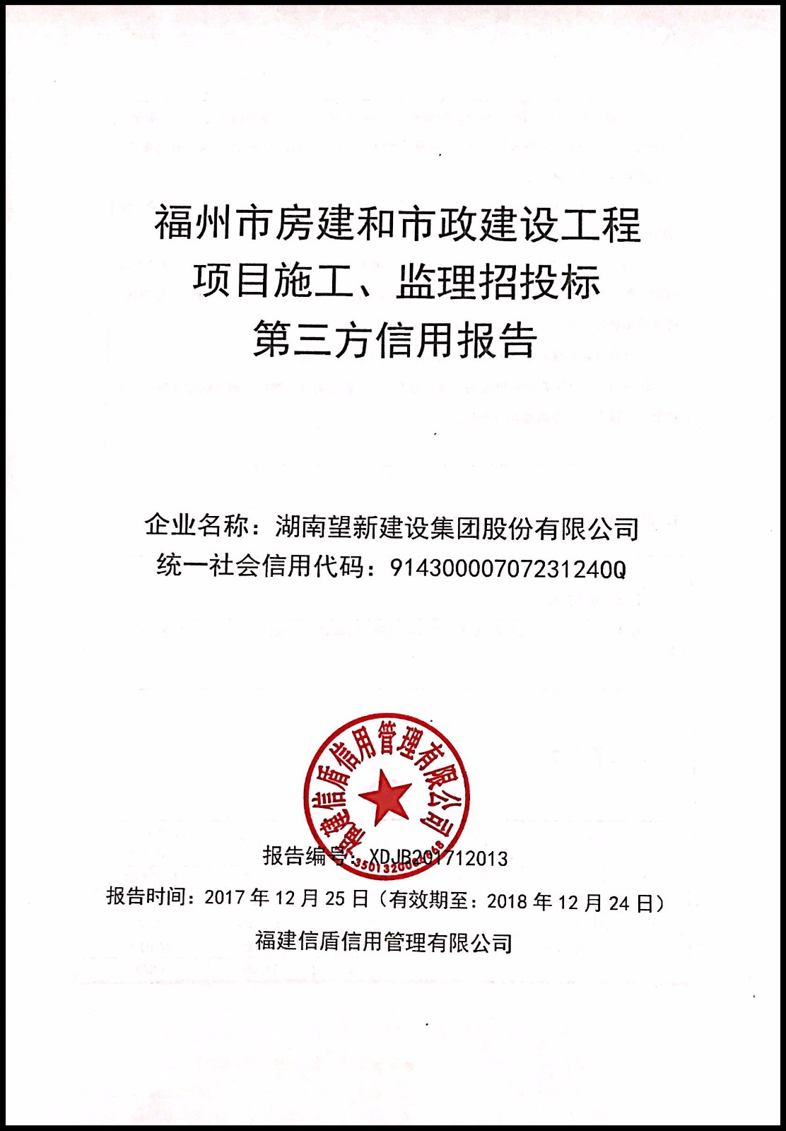 湖南望新建設集團股份有限公司 XDJB201712013